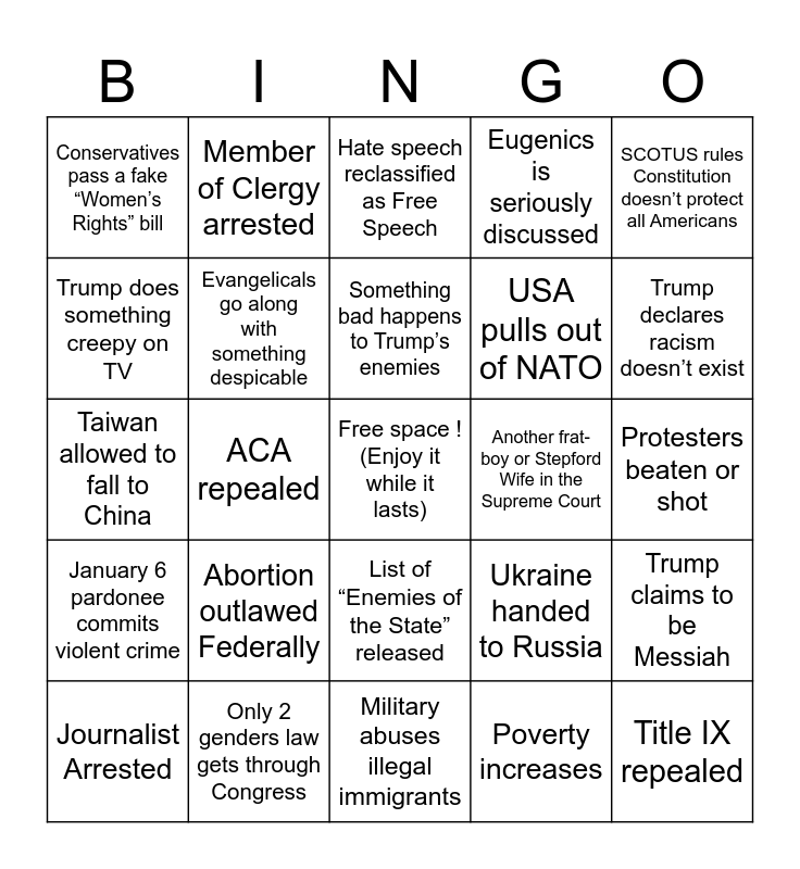 This bingo card has a free space and 24 words: Abortion outlawed Federally, Only 2 genders law gets through Congress, Something bad happens to Trump’s enemies, Journalist Arrested, SCOTUS rules Constitution doesn’t protect all Americans, Conservatives pass a fake “Women’s Rights” bill, Trump does something creepy on TV, Member of Clergy arrested, Another frat-boy or Stepford Wife in the Supreme Court, List of “Enemies of the State” released, USA pulls out of NATO, Taiwan allowed to fall to China, Ukraine handed to Russia, Trump claims to be Messiah, Evangelicals go along with something despicable, Poverty increases, Protesters beaten or shot, Hate speech reclassified as Free Speech, Trump declares racism doesn’t exist, ACA repealed, Title IX repealed, January 6 pardonee commits violent crime, Eugenics is seriously discussed and Military abuses illegal immigrants.