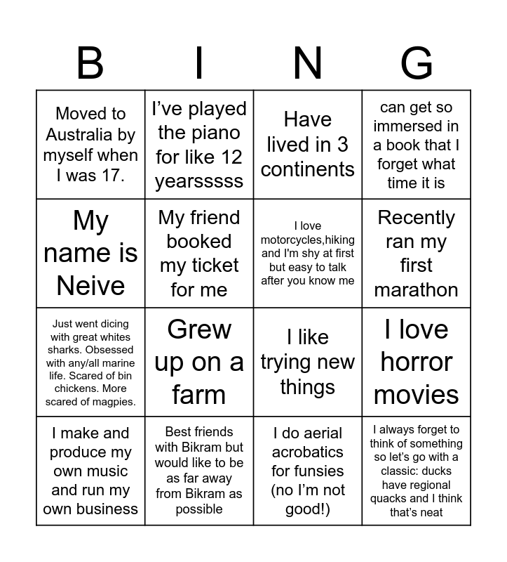 This bingo card has 72 words: Fluent in two languages: sarcasm and bad decisions, I’ve played the piano for like 12 yearsssss, I love horror movies, I can do an impression of a vacuum cleaner, I can ice-skate (sorta 😂), I have a lot of indoor plants, some of which have been alive for years, can get so immersed in a book that I forget what time it is, I love cooking, baking and making desserts, Just went dicing with great whites sharks. Obsessed with any/all marine life. Scared of bin chickens. More scared of magpies., I have a phobia of pelicans, I love cliff jumping, I’m driven a dog sled in the arctic circle, Grew up on a farm, Moved to Australia by myself when I was 17., Moved from Melbourne, I like trying new things, I love music and gigs, My name is Neive, I have an adorable mini dachshund named Rue, I do aerial acrobatics for funsies (no I’m not good!), I worked in a library, I make and produce my own music and run my own business, I played in an Elton John cover band, I run a hot chocolate blog, I have chickens, You will definitely change your opinion after you meet me ( could be good or bad haha), Passionate about sports, I am hilarious, I love classical music, My new year's resolution is learning how to handstand, I have 3 dogs, I have been stabbed, Bit of an amateur photographer 📸, The singing group I’m in won Choir of the World in 2 international categories., I recently started dancing lessons, I dance, I dance, Doing an honours project on elephants, My friend booked my ticket for me, I have a pet snake and play roller derby!, Positive attitude and goal oriented, I’ve lived in England for 6 months to play cricket, Currently doing aerial silks which is very fun and very difficult!, Can definitely do a backflip, I have had 3 knee surgeries, I always forget to think of something so let’s go with a classic: ducks have regional quacks and I think that’s neat, I have a twin, Just finished a double bachelor degree, I am from the UK, My name is Lucy, I’m from the UK and have been travelling for over a year, Love singing and playing guitar., Very good with maths, Best friends with Bikram but would like to be as far away from Bikram as possible, My prefrontal cortex has stopped developing, I'm a writer! I'm also on my way to becoming a zookeeper and I've travelled to see polar bears in Canada in the wild, Have lived in 3 continents, Recently ran my first marathon, Ive been to Europe, I thought I could out run a horse when I was younger, ambitious yes, I hiked Cradle Mountain in -15 weather, Studying teaching, From the US, I’m a paediatric physician trainee, I love making dad jokes, love to travel. Went skydiving on my 21st birthday, I love learning new things, I don’t like coffee., I love motorcycles,hiking and I'm shy at first but easy to talk after you know me, I have worked as a remote teacher for the past 5 years!, Certifiably clumsy, have broken three bones, i like board games and eating sweet treats! i like fashion movies and indie music, I grew up on a dairy farm and Black belt for over 10 years.