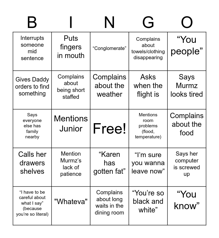 This bingo card has a free space and 24 words: Mention Murmz’s lack of patience, "Whateva", Complains about the weather, “I have to be careful about what I say” (because you’re so literal), “You people”, Interrupts someone mid sentence, Gives Daddy orders to find something, Puts fingers in mouth, Mentions room problems (flood, temperature), “Karen has gotten fat”, Asks when the flight is, Says everyone else has family nearby, “I’m sure you wanna leave now”, Says her computer is screwed up, Complains about being short staffed, “You’re so black and white”, Complains about the food, “Conglomerate”, Says Murmz looks tired, Mentions Junior, “You know”, Calls her drawers shelves, Complains about towels/clothing disappearing and Complains about long waits in the dining room.