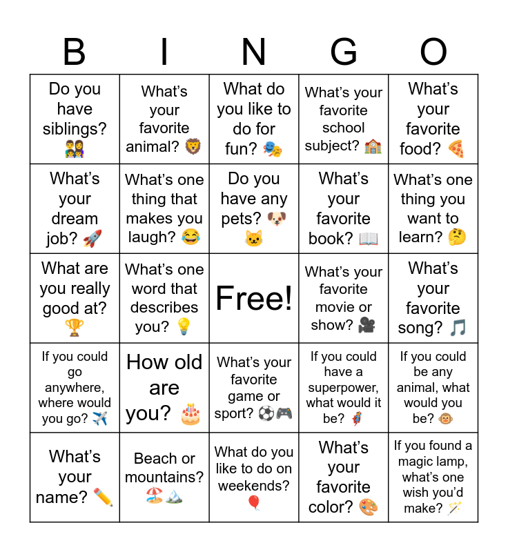 This bingo card has a free space and 24 words: What’s your name? ✏️, How old are you? 🎂, Do you have any pets? 🐶🐱, What’s your favorite color? 🎨, What’s your favorite food? 🍕, Do you have siblings? 👨👩👧👦, What’s your favorite animal? 🦁, What do you like to do for fun? 🎭, What’s your favorite movie or show? 🎥, What’s your favorite song? 🎵, What are you really good at? 🏆, What’s one thing that makes you laugh? 😂, If you could have a superpower, what would it be? 🦸, If you could be any animal, what would you be? 🐵, What’s your dream job? 🚀, Beach or mountains? 🏖️🏔️, What do you like to do on weekends? 🎈, What’s your favorite school subject? 🏫, What’s one thing you want to learn? 🤔, If you could go anywhere, where would you go? ✈️, What’s one word that describes you? 💡, What’s your favorite game or sport? ⚽🎮, What’s your favorite book? 📖 and If you found a magic lamp, what’s one wish you’d make? 🪄.