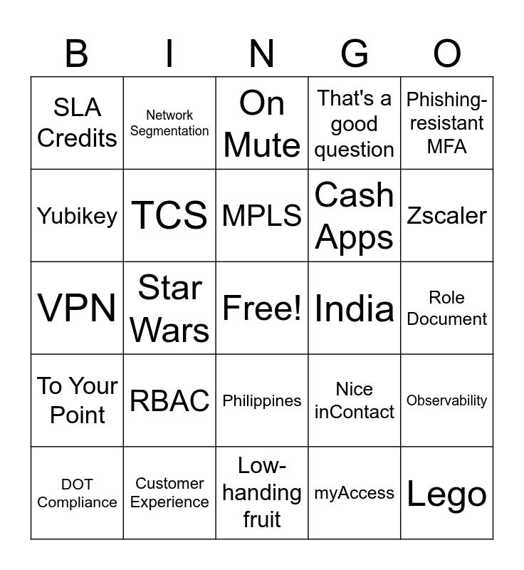 This bingo card has a free space and 24 words: RBAC, Customer Experience, MPLS, DOT Compliance, Phishing-resistant MFA, SLA Credits, Yubikey, Network Segmentation, India, Philippines, Cash Apps, VPN, Nice inContact, Observability, TCS, myAccess, Role Document, On Mute, Zscaler, Star Wars, Lego, To Your Point, That's a good question and Low-handing fruit.