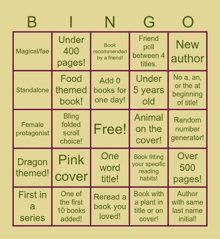 This bingo card has a free space and 24 words: Pink cover, One of the first 10 books added!, Add 0 books for one day!, First in a series, New author, Magical/fae, Standalone, Under 400 pages!, Animal on the cover!, One word title!, Under 5 years old, Female protagonist, Book fitting your specific reading habits!, Over 500 pages!, Food themed book!, Book with a plant in title or on cover!, Random number generator!, Book recommended by a friend!, No a, an, or the at beginning of title!, Bling folded scroll choice!, Author with same last name initial!, Dragon themed!, Friend poll between 4 titles. and Reread a book you loved!.
