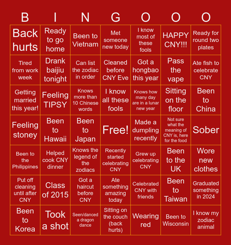 This bingo card has a free space and 48 words: Celebrated CNY with friends, Pass the vape, Sitting on the couch (back hurts), Been to Hawaii, Knows more than 10 Chinese words, Sober, Ready to go home, Took a shot, HAPPY CNY!!!, Recently started celebrating CNY, Ready for round two plates, Met someone new today, Sitting on the floor, Knows how many day are in a lunar new year, Put off cleaning until after CNY, Not sure what the meaning of CNY is, here for the food, Tired from work week, Ate fish to celebrate CNY, Been to Taiwan, I know most of these fools, Got a hongbao this year, Been to Japan, Back hurts, Drank baijiu tonight, Graduated something in 2024, Can list the zodiac in order, Been to China, Been to Korea, I know all these fools, Feeling TIPSY, Been to Wisconsin, Made a dumpling recently, Wore new clothes, Class of 2015, Feeling stoney, Grew up celebrating CNY, Been to the UK, Getting married this year!, Knows the legend of the zodiacs, Got a haircut before CNY, Been to the Philippines, I know my zodiac animal, Been to Vietnam, Seen/danced a dragon dance, Cleaned before CNY Eve, Ate something amazing today, Helped cook CNY dinner and Wearing red.