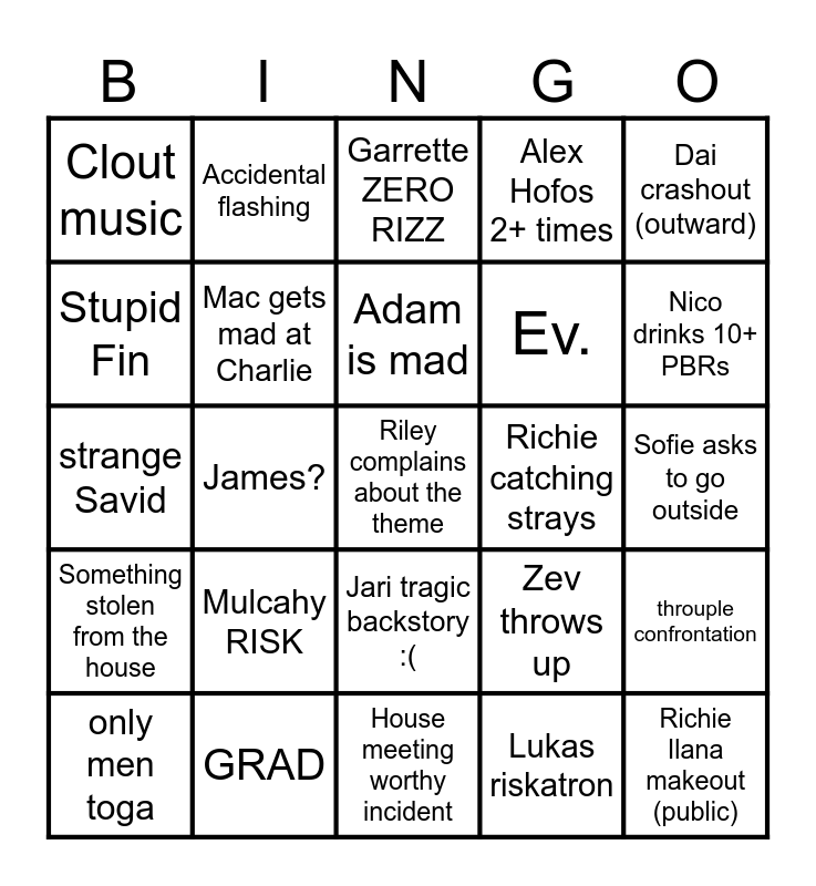 This bingo card has a free space and 24 words: Mulcahy RISK, GRAD, Adam is mad, only men toga, Dai crashout (outward), Clout music, Stupid Fin, Accidental flashing, Richie catching strays, Jari tragic backstory :(, Ev., strange Savid, Zev throws up, throuple confrontation, Mac gets mad at Charlie, Lukas riskatron, Sofie asks to go outside, Garrette ZERO RIZZ, Nico drinks 10+ PBRs, James?, Richie Ilana makeout (public), Something stolen from the house, Alex Hofos 2+ times and House meeting worthy incident.