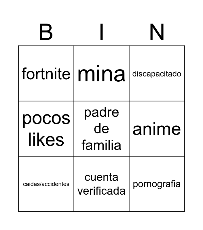 This bingo card has a free space and 8 words: anime, discapacitado, mina, caidas/accidentes, fortnite, pornografia, pocos likes and cuenta verificada.