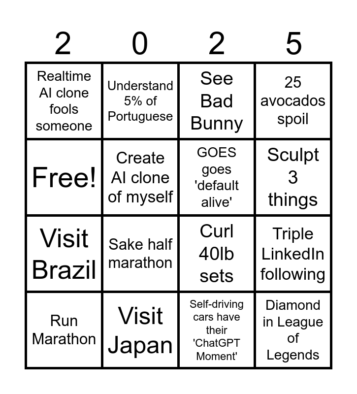 This bingo card has 16 words: Visit Japan, Triple LinkedIn following, See Bad Bunny, Realtime AI clone fools someone, Visit Brazil, Understand 5% of Portuguese, Curl 40lb sets, Self-driving cars have their 'ChatGPT Moment', Free!, Create AI clone of myself, Run Marathon, 25 avocados spoil, Sake half marathon, Sculpt 3 things, GOES goes 'default alive' and Diamond in League of Legends.