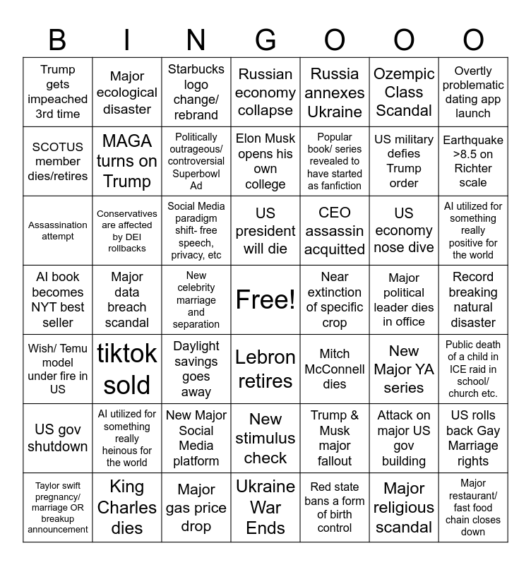 This bingo card has a free space and 48 words: Trump & Musk major fallout, US military defies Trump order, Ukraine War Ends, Major data breach scandal, Social Media paradigm shift- free speech, privacy, etc, Record breaking natural disaster, Major ecological disaster, King Charles dies, Ozempic Class Scandal, Lebron retires, Overtly problematic dating app launch, Russian economy collapse, US economy nose dive, CEO assassin acquitted, US gov shutdown, Major political leader dies in office, SCOTUS member dies/retires, Earthquake >8.5 on Richter scale, Attack on major US gov building, Russia annexes Ukraine, Popular book/ series revealed to have started as fanfiction, New celebrity marriage and separation, Trump gets impeached 3rd time, MAGA turns on Trump, US rolls back Gay Marriage rights, Politically outrageous/ controversial Superbowl Ad, AI utilized for something really positive for the world, Taylor swift pregnancy/ marriage OR breakup announcement, US president will die, Conservatives are affected by DEI rollbacks, Major religious scandal, Near extinction of specific crop, Public death of a child in ICE raid in school/ church etc., AI utilized for something really heinous for the world, AI book becomes NYT best seller, Mitch McConnell dies, New Major YA series, Assassination attempt, Daylight savings goes away, New Major Social Media platform, Wish/ Temu model under fire in US, Major restaurant/ fast food chain closes down, Starbucks logo change/ rebrand, Major gas price drop, Elon Musk opens his own college, New stimulus check, tiktok sold and Red state bans a form of birth control.
