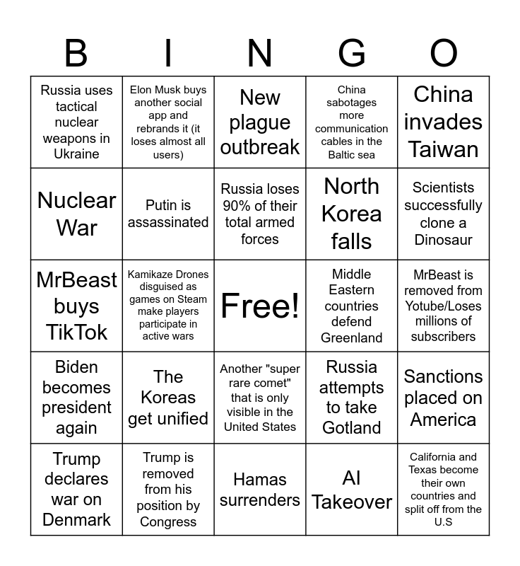 This bingo card has a free space and 24 words: Trump declares war on Denmark, The Koreas get unified, Russia loses 90% of their total armed forces, AI Takeover, China invades Taiwan, Russia uses tactical nuclear weapons in Ukraine, Elon Musk buys another social app and rebrands it (it loses almost all users), New plague outbreak, Middle Eastern countries defend Greenland, MrBeast is removed from Yotube/Loses millions of subscribers, MrBeast buys TikTok, Putin is assassinated, Russia attempts to take Gotland, Sanctions placed on America, Nuclear War, Trump is removed from his position by Congress, Hamas surrenders, China sabotages more communication cables in the Baltic sea, Scientists successfully clone a Dinosaur, Biden becomes president again, Kamikaze Drones disguised as games on Steam make players participate in active wars, Another "super rare comet" that is only visible in the United States, North Korea falls and California and Texas become their own countries and split off from the U.S.
