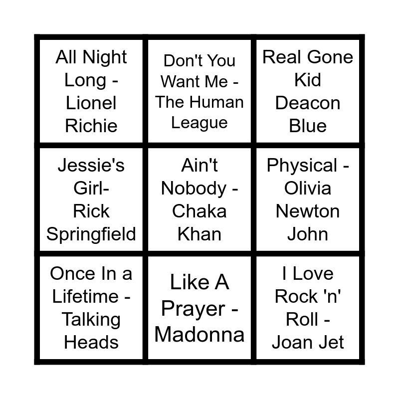This bingo card has 62 words: Don't You (Forget About Me) - Simple Minds, Tainted Love - Soft Cell, I wanna Dance with Somebody - Whitney Houston, Billie Jean - Micahel Jackson, Like a Virgin - Madonna, Love Shack - The B-52's, Once In a Lifetime - Talking Heads, Brass In Pocket - Pretenders, I Love Rock 'n' Roll - Joan Jet, Livin' On a Prayer - Bon Jovi, Jessie's Girl- Rick Springfield, Paradise City - Guns N' Roses, Physical - Olivia Newton John, Eye of the Tiger - Survivor, Flashdance... What A Feeling - Irene Cara, All Night Long - Lionel Richie, Red Red Wine - UB40, Ain't Nobody - Chaka Khan, Push It - Salt-N-Pepa, Like A Prayer - Madonna, Summer of '69 - Bryan Adams, Real Gone Kid Deacon Blue, Jump - Van Halen, (I Just) Died In Your Arms - Curring Crew, We Didn't Start the Fire - Billy Joel, Footloose - Kenny Loggins, Wake Me Up Before You Go-Go - Wham!, My Sharona - The Knack, Girls Just Want to Have Fun - Cyndi Lauper, Play That Funky Music - Wild Cherry, Celebration - Kool & The Gang, Y.M.C.A. - Village People, We Are Family - Sister Sledge, I'm So Excited - The Pointer Sisters, That's the Way (I Like It) - KC & The Sunshine Band, Don't You Want Me - The Human League, La Bamba - Los Lobos, She Drives Me Crazy - Fine Young Cannibals, 99 Red Balloons - Nena, Give It Up - KC & The Sunshine Band, Hungry Like the Wolf - Duran Duran, Take on Me a-ha, You Make My Dreams (Come True) - Daryl Hall & John Oates, Never Gonna Give You Up - Rick Astley, Video Killed The Radio Star - The Buggles, Walk of Life - Dire Straits, Thriller - Michael Jackson, The Power of Love - Huey Lewis & The News, Uptown Girl - Billy Joel, I Still Haven't Found What I'm Looking For - U2, Need You Tonight - INXS, Just Can't Get Enough - Depeche Mode, What's Love Got to Do with It - Tina Turner, Start Me Up - The Rolling Stones, Faith - George Michael, Our House - Madness, True - Spandau Ballet, London Calling - The Clash, Whip It - Devo, One Way or Another - Blondie, Sexual Healing - Marvin Gaye and Whole of the Moon - Waterboys.