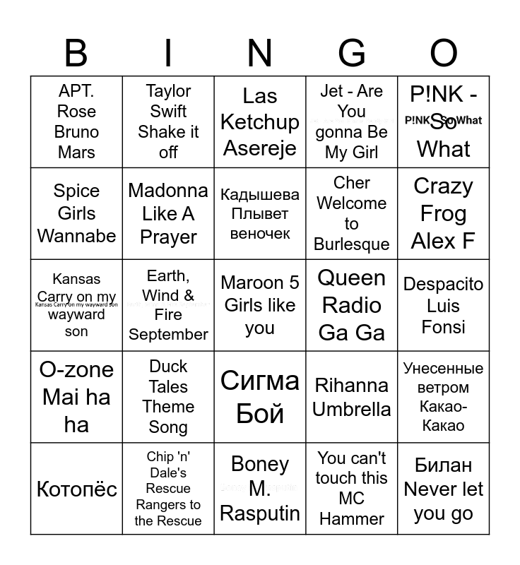 This bingo card has 8 images, a free space and 24 words: Duck Tales Theme Song, Chip 'n' Dale's Rescue Rangers to the Rescue, Кадышева Плывет веночек, Котопёс, P!NK - So What, APT. Rose Bruno Mars, Spice Girls Wannabe, Taylor Swift Shake it off, Queen Radio Ga Ga, Сигма Бой, Cher Welcome to Burlesque, Kansas Carry on my wayward son, Rihanna Umbrella, Унесенные ветром Какао-Какао, Madonna Like A Prayer, You can't touch this MC Hammer, Despacito Luis Fonsi, Las Ketchup Asereje, Crazy Frog Alex F, Earth, Wind & Fire September, Билан Never let you go, O-zone Mai ha ha, Jet - Are You gonna Be My Girl and Boney M. Rasputin.