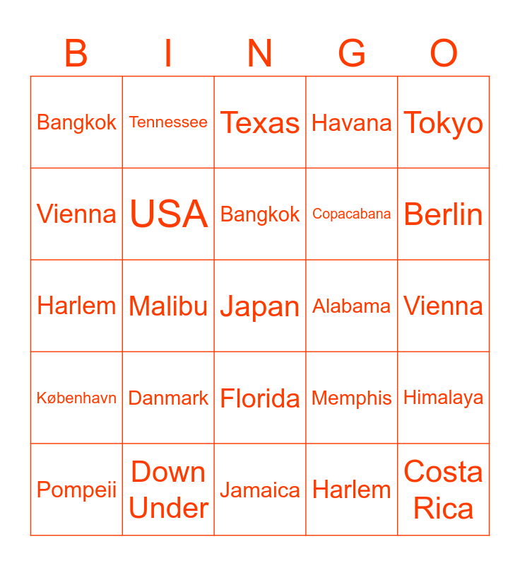 ⚠ This card has duplicate items: London (2), New York (2), Texas (2), Galway (2), Tennessee (2), Budapest (2), Istanbul (2), Waterloo (2), Ibiza (2), Memphis (2), Havana (2), California (2), USA (2), Alabama (2), Down Under (2), Bangkok (2), Pompeii (2), Vienna (2), Detroit (2), Africa (2), West Virginia (2), Copacabana (2), Japan (2), Paris (2), Malibu (2), Barcelona (2), Tokyo (2), Miami (2), Himalaya (2), Dubai (2), Danmark (2), Compton (2), Florida (2), Harlem (2), Costa Rica (2), San Jose (2), Jamaica (2), Vegas (2), Berlin (2), København (2), Malaga (2), Gangnam (2)