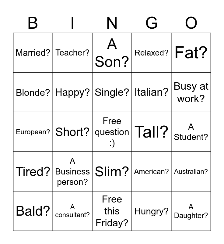 This bingo card has a free space and 24 words: A Business person?, A consultant?, Single?, Bald?, Fat?, Married?, Blonde?, Teacher?, Tall?, Slim?, Italian?, European?, American?, Australian?, Happy?, Hungry?, A Student?, A Son?, Busy at work?, Short?, A Daughter?, Tired?, Relaxed? and Free this Friday?.
