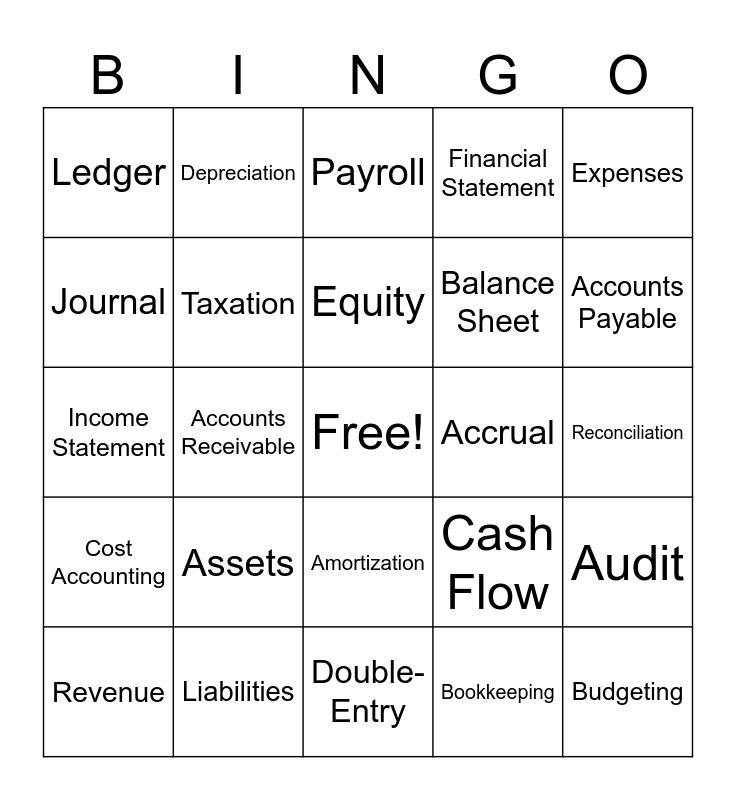 This bingo card has a free space and 24 words: Assets, Liabilities, Equity, Revenue, Expenses, Ledger, Journal, Depreciation, Accrual, Amortization, Balance Sheet, Income Statement, Cash Flow, Audit, Taxation, Bookkeeping, Reconciliation, Payroll, Accounts Payable, Accounts Receivable, Budgeting, Cost Accounting, Financial Statement and Double-Entry.