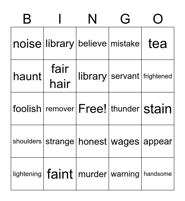 This bingo card has a free space and 28 words: appear, imagine, servant, warning, haunt, believe, library, shoulders, thunder, lightening, foolish, mistake, faint, murder, frightened, modern, strange, fair hair, library, honest, noise, terrible, handsome, remover, stain, wages, tea and trick.