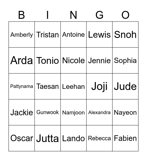 This bingo card has a free space and 24 words: Gunwook, Jutta, Nicole, Oscar, Snoh, Amberly, Arda, Tristan, Joji, Namjoon, Jennie, Pattynama, Alexandra, Nayeon, Tonio, Rebecca, Jude, Antoine, Sophia, Taesan, Fabien, Jackie, Lewis and Lando.