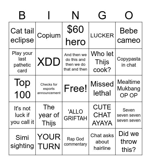 This bingo card has a free space and 25 words: The year of Thijs, Rap God commentary, And then we do this and then we do that and then, Simi sighting, Bebe cameo, Cat tail eclipse, Play your last pathetic card, Copium, Missed lethal, 'ALLO GRIFTAH, Who let Thijs cook?, Top 100, CUTE CHAT AYAYA, Seven seven seven seven seven, XDD, Practice game doesn't count, Mealtime Mukbang OP OP, $60 hero, Copypasta in chat, Checks for esports announcement, Did we throw this?, YOUR TURN, It's not luck if you call it, LUCKER and Chat asks about hairline.