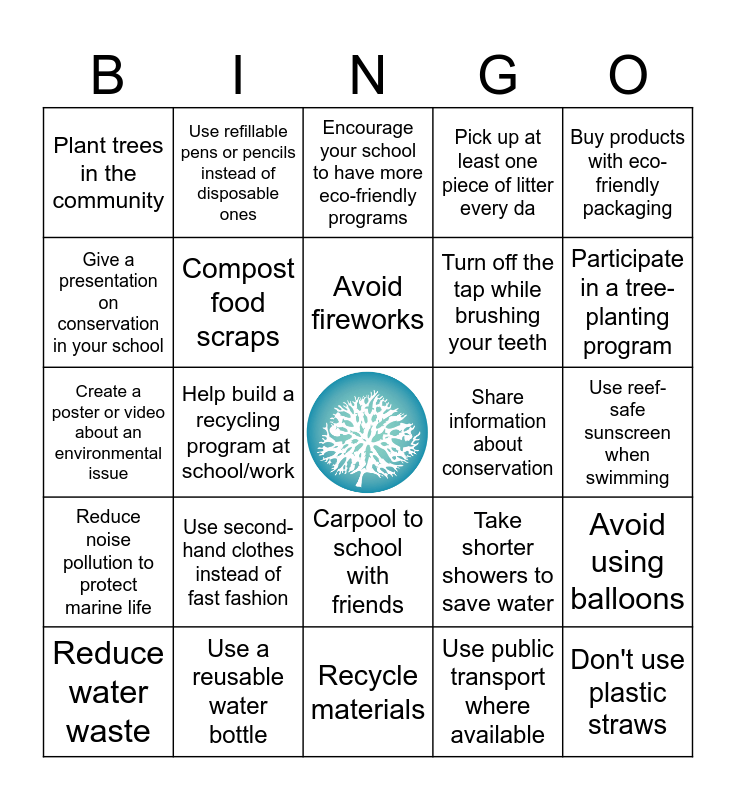This bingo card has a free space and 29 words: Reduce water waste, Turn off lights when leaving a room, Help build a recycling program at school/work, Pack lunch in a reusable container instead of plastic bags, Plant trees in the community, Encourage your school to have more eco-friendly programs, Compost food scraps, Use second-hand clothes instead of fast fashion, Share information about conservation, Use a reusable water bottle, Use reef-safe sunscreen when swimming, Don't use plastic straws, Recycle materials, Use public transport where available, Participate in a tree-planting program, Use a reusable shopping bag, Carpool to school with friends, Reduce noise pollution to protect marine life, Buy products with eco-friendly packaging, Create a poster or video about an environmental issue, Take shorter showers to save water, Reduce food waste, Turn off the tap while brushing your teeth, Give a presentation on conservation in your school, Pick up at least one piece of litter every da, Use refillable pens or pencils instead of disposable ones, Avoid using balloons, Avoid fireworks and Try to identify different tree or plant species at your school.