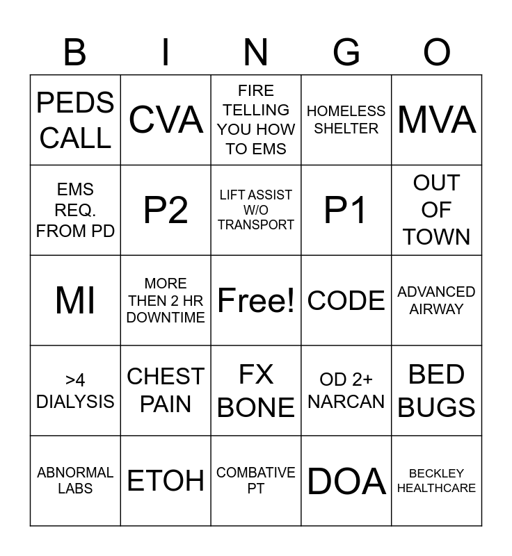 This bingo card has a free space and 24 words: CHEST PAIN, ETOH, LIFT ASSIST W/O TRANSPORT, ABNORMAL LABS, MVA, PEDS CALL, EMS REQ. FROM PD, CVA, CODE, FX BONE, P1, MI, OD 2+ NARCAN, BED BUGS, P2, DOA, ADVANCED AIRWAY, FIRE TELLING YOU HOW TO EMS, OUT OF TOWN, MORE THEN 2 HR DOWNTIME, BECKLEY HEALTHCARE, >4 DIALYSIS, HOMELESS SHELTER and COMBATIVE PT.