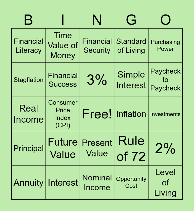 This bingo card has a free space and 29 words: Annuity, Compound Interest, Consumer Price Index (CPI), Deflation, Financial Literacy, Financial Security, Financial Success, Future Value, Inflation, Interest, Investments, Level of Living, Nominal Income, Opportunity Cost, Paycheck to Paycheck, Personal Finance, Present Value, Principal, Purchasing Power, Real Income, Rule of 72, Savings, Simple Interest, Stagflation, Standard of Living, Time Value of Money, 2%, 3% and 5%.