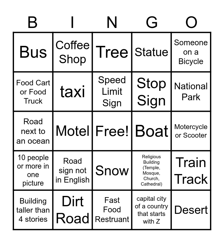 This bingo card has a free space and 24 words: Building taller than 4 stories, Road sign not in English, Speed Limit Sign, capital city of a country that starts with Z, Someone on a Bicycle, Bus, Coffee Shop, Tree, Boat, Motercycle or Scooter, Road next to an ocean, taxi, Religious Building (Temple, Mosque, Church, Cathedral), Train Track, Food Cart or Food Truck, Dirt Road, Fast Food Restruant, Statue, National Park, 10 people or more in one picture, Motel, Snow, Stop Sign and Desert.