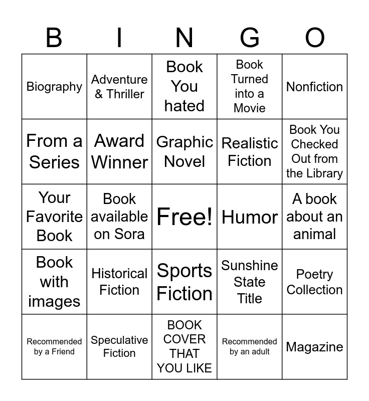 This bingo card has a free space and 24 words: Historical Fiction, Speculative Fiction, Graphic Novel, Recommended by a Friend, Nonfiction, Biography, From a Series, Adventure & Thriller, Humor, Sports Fiction, Realistic Fiction, Your Favorite Book, Sunshine State Title, Poetry Collection, Award Winner, Recommended by an adult, A book about an animal, Book You hated, Book You Checked Out from the Library, Book available on Sora, Magazine, Book with images, Book Turned into a Movie and BOOK COVER THAT YOU LIKE.