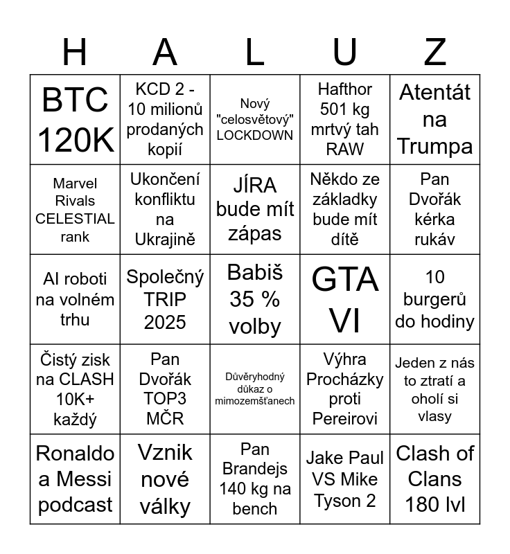 This bingo card has a free space and 24 words: Pan Dvořák TOP3 MČR, Vznik nové války, JÍRA bude mít zápas, Ronaldo a Messi podcast, Atentát na Trumpa, BTC 120K, Marvel Rivals CELESTIAL rank, KCD 2 - 10 milionů prodaných kopií, GTA VI, Důvěryhodný důkaz o mimozemšťanech, Někdo ze základky bude mít dítě, AI roboti na volném trhu, Výhra Procházky proti Pereirovi, Jeden z nás to ztratí a oholí si vlasy, Ukončení konfliktu na Ukrajině, Jake Paul VS Mike Tyson 2, 10 burgerů do hodiny, Nový "celosvětový" LOCKDOWN, Pan Dvořák kérka rukáv, Společný TRIP 2025, Clash of Clans 180 lvl, Čistý zisk na CLASH 10K+ každý, Hafthor 501 kg mrtvý tah RAW and Pan Brandejs 140 kg na bench.