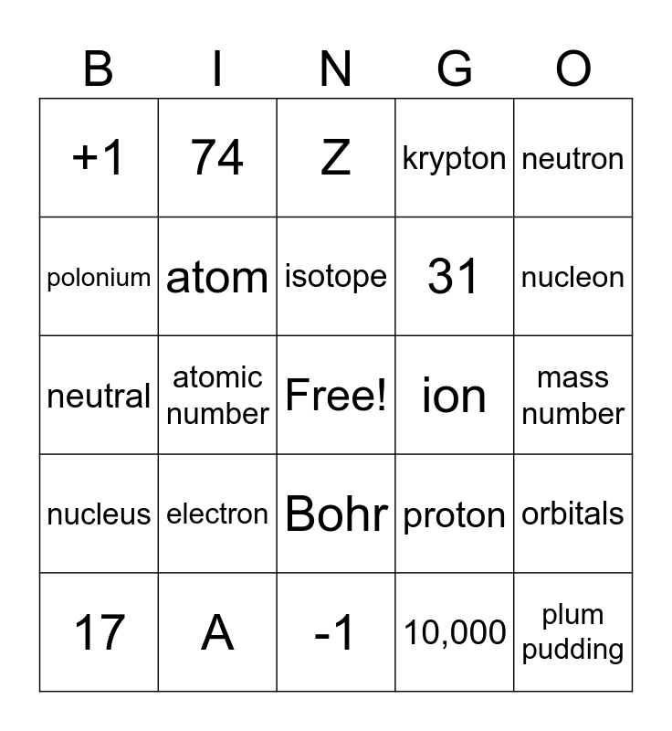 This bingo card has a free space and 24 words: electron, A, isotope, 17, neutron, +1, polonium, 74, ion, Bohr, 31, neutral, proton, orbitals, atom, 10,000, mass number, Z, nucleon, atomic number, plum pudding, nucleus, krypton and -1.