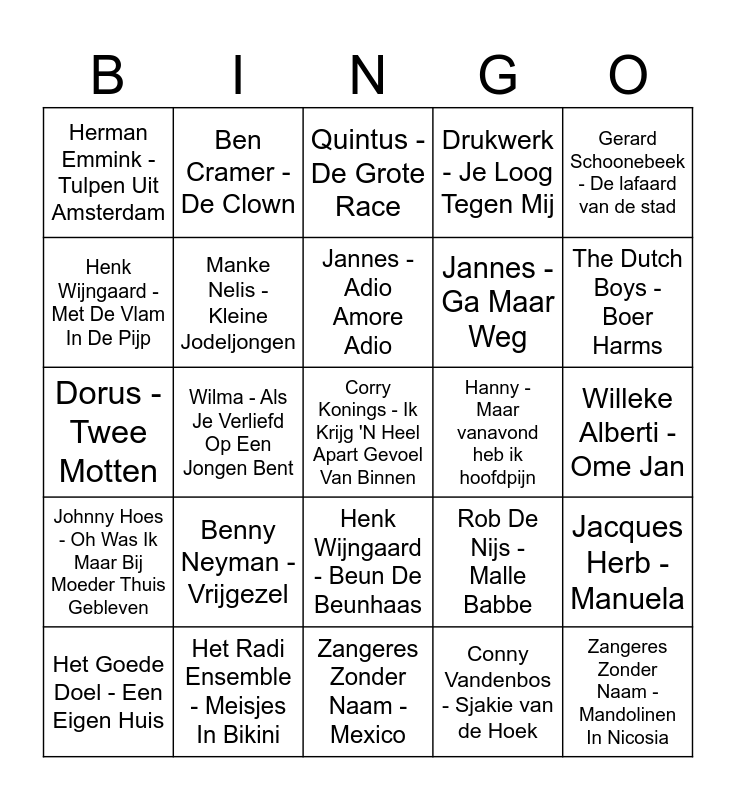 This bingo card has 49 words: Free!, Corry Konings - Ik Krijg 'N Heel Apart Gevoel Van Binnen, Koos Alberts - Ik Verscheurde Je Foto, Zangeres Zonder Naam - Mexico, Benny Neyman - Vrijgezel, Corry Konings - Huilen Is Voor Jou Te Laat, Ben Cramer - De Clown, Arne Jansen - Meisjes Met Rode Haren, Henk Wijngaard - Met De Vlam In De Pijp, Jannes - Zwevend naar 't geluk, Manke Nelis - Kleine Jodeljongen, Drukwerk - Je Loog Tegen Mij, Jacques Herb - Manuela, Rob De Nijs - Malle Babbe, Renée De Haan - Vuile Huichelaar, Benny Neyman - Waarom Fluister Ik Je Naam Nog, Jannes - Adio Amore Adio, Hanny - Maar vanavond heb ik hoofdpijn, Don Mercedes - Rocky, Gerard Schoonebeek - De lafaard van de stad, Wilma - Als Je Verliefd Op Een Jongen Bent, Conny Vandenbos - Sjakie van de Hoek, Herman Emmink - Tulpen Uit Amsterdam, Jannes - Ga Maar Weg, Vinzzent - Dromendans, The Dutch Boys - Boer Harms, Het Goede Doel - Een Eigen Huis, Anneke Gronloh - Brandend Zand, Henk Wijngaard - Beun De Beunhaas, Johnny Hoes - Oh Was Ik Maar Bij Moeder Thuis Gebleven, Zangeres Zonder Naam - Keetje Tippel, De Paladijns - Bouw Geen Luchtkastelen, De Four Tak - Ik Heb 'N Hart Zo Groot Als 'N Klerenkast, Hanny - Ga Met Me Mee, Het Radi Ensemble - Meisjes In Bikini, B.B. Band - Stille Willie, Anita van de Rapsodies - Die Kleine Merel, Tol Hansse - Big City - Orginele Versie 1978, Willeke Alberti - Ome Jan, De Evening Stars - Onze Poes En Buurmans Kater, Les Amis - Ik schrijf je naam, Rinus Okken - Voor de liefde een 10, Zangeres Zonder Naam - Mandolinen In Nicosia, Armand - Ben Ik Te Min, Dorus - Twee Motten, Quintus - De Grote Race, Sylvain Poons - De Zuiderzee Ballade, Lucas en Gea - Kristall der Heimat and Theo Diepenbrock - Als 'N Lading Dynamiet.