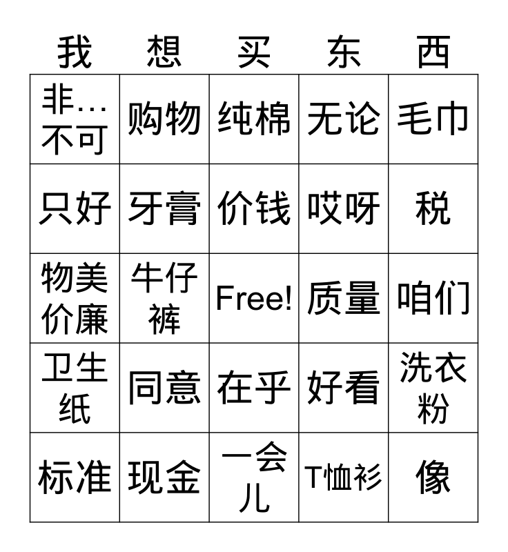 This bingo card has a free space and 32 words: T恤衫, 毛衣, 牛仔裤, 需要, 卫生纸, 牙膏, 毛巾, 洗衣粉, 购物, 牌子, 价钱, 纯棉, 名牌( 儿), 时髦, 质量, 道理, 标准, 物美价廉, 在乎, 同意, 好看, 贫, 咱们, 现金, 像, 无论, 哎呀, 只好, 非…不可, 一会儿, 加 and 税.