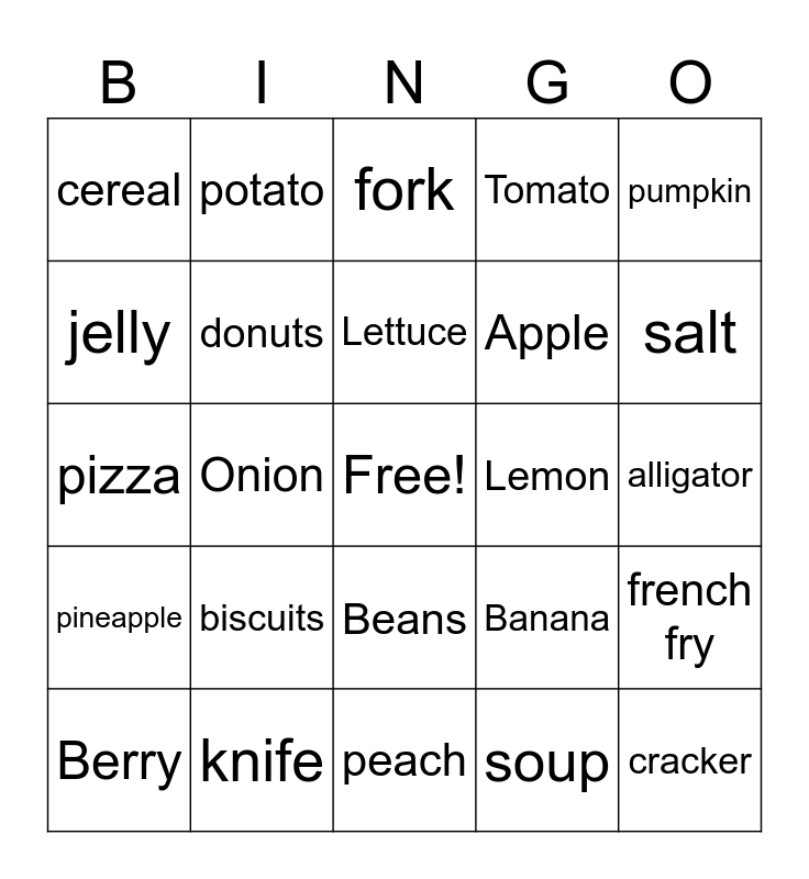 This bingo card has a free space and 39 words: Lobster, Pickle, bread, donuts, Berry, Beans, Lettuce, butter, pumpkin, pineapple, Onion, Tomato, cracker, alligator, Lemon, biscuits, Shrimp, cereal, grapes, Banana, jelly, peach, Apple, salt, pepper, syrup, peas, carrot, turkey, potato, chicken, spoon, fork, knife, soup, crawfish, french fry, pizza and popcorn.