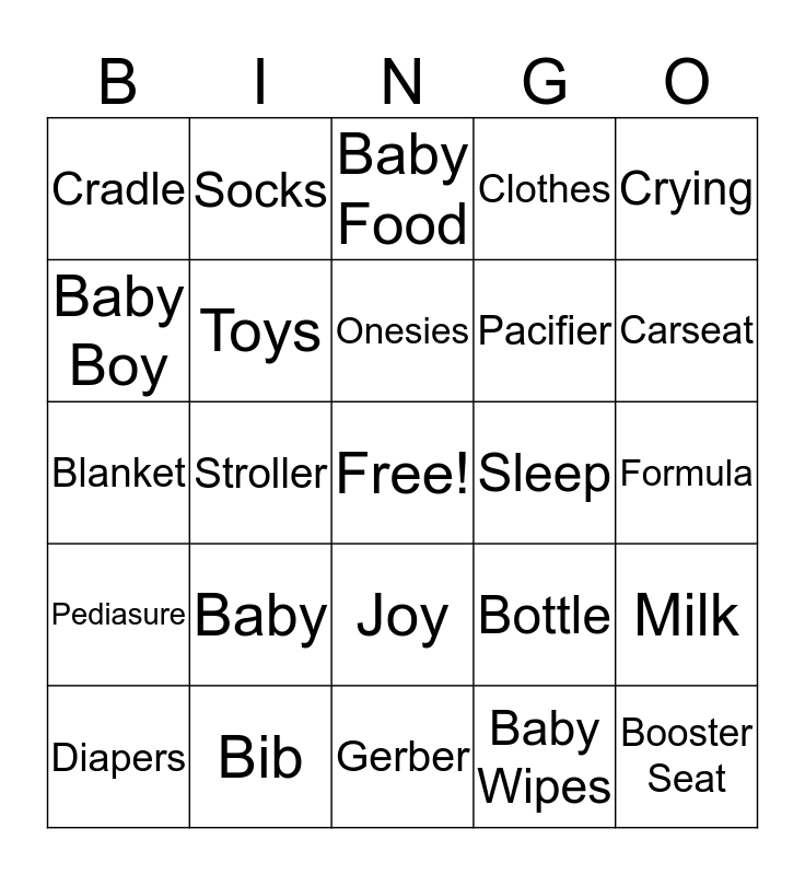This bingo card has a free space and 24 words: Baby, Bib, Onesies, Diapers, Crying, Cradle, Baby Boy, Socks, Sleep, Joy, Pacifier, Blanket, Bottle, Milk, Toys, Baby Wipes, Formula, Baby Food, Carseat, Stroller, Booster Seat, Pediasure, Clothes and Gerber.