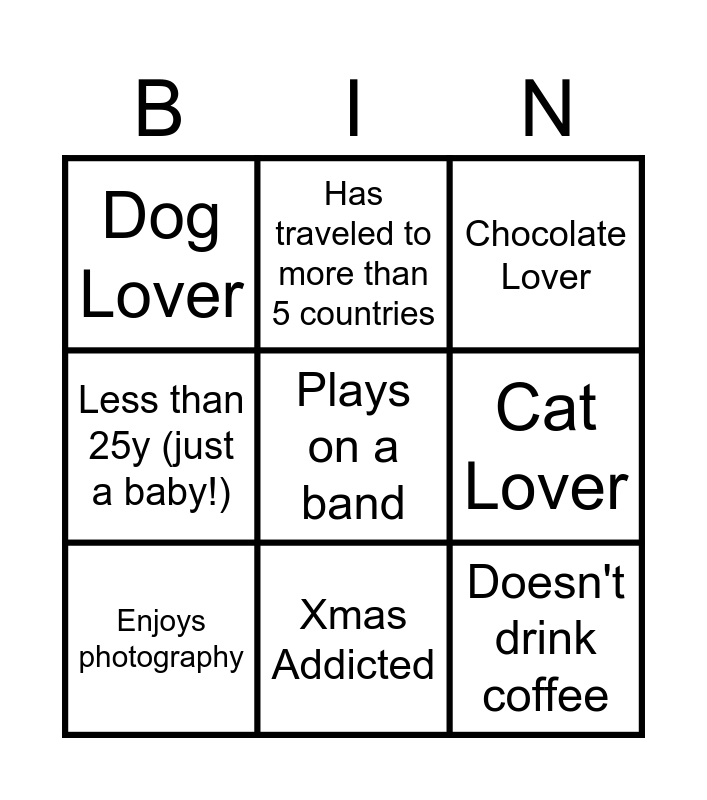 This bingo card has a free space and 14 words: Owns a horse, Lived in Brazil, Cat Lover, Dog Lover, Chocolate Lover, Less than 25y (just a baby!), Working in Nokia for more than 15y, Loves to bake, Has completed a certification course recently, Has traveled to more than 5 countries, Doesn't drink coffee, Enjoys photography, Xmas Addicted and Born outside Europe.