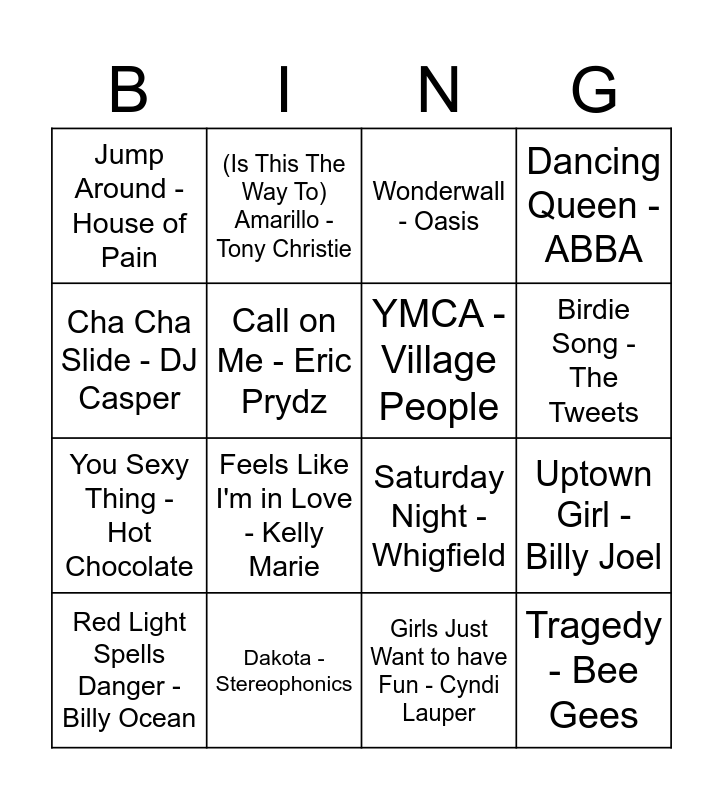This bingo card has 40 words: Oops Upside Your Head - Gap Band, Saturday Night - Whigfield, Do the Conga - Black Lace, YMCA - Village People, The Time Warp - Damian, Can Can - Bad Manners, Birdie Song - The Tweets, Let's Twist Again - Chubby Checker, Cha Cha Slide - DJ Casper, Tragedy - Bee Gees, Uptown Girl - Billy Joel, Dancing Queen - ABBA, Red Light Spells Danger - Billy Ocean, Girls Just Want to have Fun - Cyndi Lauper, Dakota - Stereophonics, I'm in the Mood for Dancing - The Nolans, Sit Down - James, Jump Around - House of Pain, Delilah - Tom Jones, Wonderwall - Oasis, Bohemian Rhapsody - Queen, Sweet Caroline - Neil Diamond, You Sexy Thing - Hot Chocolate, Call on Me - Eric Prydz, Watermelon Sugar - Harry Styles, Thriller - Michael Jackson, Come on Eileen - Dexys Midnight Runners, Gold - Spandau Ballet, Gangnam Style - PSY, Making your Mind Up - Bucks Fizz, Macarena - Los del Rio, Kung Fu Fighting - Carl Douglas, 9 to 5 - Dolly Parton, The Locomotion - Kylie Minogue, Feels Like I'm in Love - Kelly Marie, House of Fun - Madness, Wannabe - Spice Girls, Pink Pony Club - Chappell Roan, (Is This The Way To) Amarillo - Tony Christie and Don't Stop Believin - Journey.