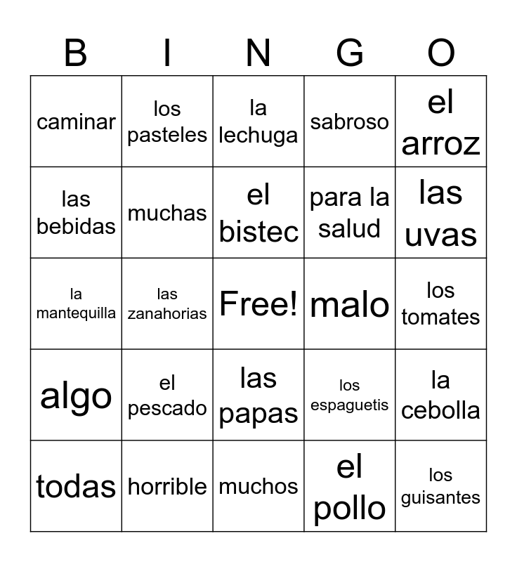 This bingo card has a free space and 42 words: la cena, el bistec, la carne, el pescado, el pollo, la cebolla, los guisantes, las judías, la lechuga, las papas, los tomates, las uvas, las zanahorias, el arroz, los cereales, los espaguetis, las grasas, la mantequilla, el helado, los pasteles, las bebidas, Tengo hambre., Tengo sed., caminar, hacer ejercicio, levantar pesas, para la salud, deber, creer, ¿Por qué?, porque, algo, muchas, muchos, todos, todas, horrible, malo, mala, sabrosa, sabroso and cada día.