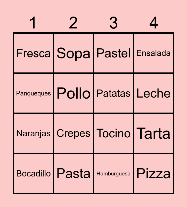 This bingo card has 24 words: Huevos, Pan, Leche, Pescado, Panqueques, Fresca, Pollo, Sopa, Pasta, Helado, Naranjas, Tocino, Plàtano, Manzana, Patatas, Queso, Hamburguesa, Pastel, Crepes, Tarta, Bocadillo, Pizza, Ensalada and Papas Fritas.