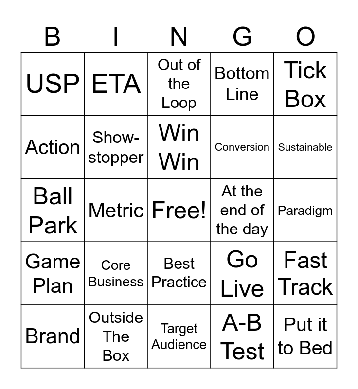 This bingo card has a free space and 40 words: Leading Edge, Ball Park, Add Value, Show-stopper, Outside The Box, Best Practice, Win Win, Lessons Learned, Tick Box, Game Plan, Metric, Bottom Line, Put it to Bed, Paradigm, At the end of the day, Core Business, Value Proposition, USP, Band-width, Out of the Loop, Fast Track, A-B Test, Conversion, Action, Mission Critical, Open Source, Road Map, Buzz, Up to Speed, Viral, Agenda, Brand, Bench-mark, Go Live, Sustainable, Target Audience, Low Hanging Fruit, SEO, ETA and Offline.