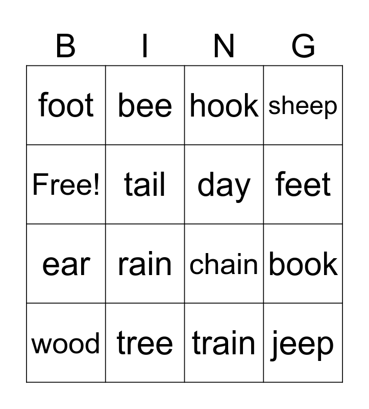 This bingo card has 16 words: tree, book, hook, foot, ear, bee, chain, train, Free!, tail, wood, sheep, rain, feet, day and jeep.