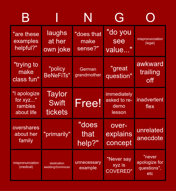 This bingo card has a free space and 24 words: "primarily", destination wedding/Dominican, German grandmother, mispronunciation (medical), mispronunciation (legal), "are these examples helpful?", "trying to make class fun", laughs at her own joke, immediately asked to re-demo lesson, "does that help?", "great question", "I apologize for xyz..." rambles about life, over-explains concept, unrelated anecdote, "policy BeNeFiTs", "Never say xyz is COVERED", inadvertent flex, "does that make sense?", awkward trailing off, Taylor Swift tickets, "never apologize for questions", etc, overshares about her family, "do you see value..." and unnecessary example.