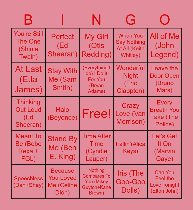 This bingo card has a free space and 30 words: Because You Loved Me (Celine Dion), Total Eclipse of the Heart (Bonnie Tyler), Halo (Beyonce), Just The Way You Are (Bruno Mars), You're Still The One (Shinia Twain), My Girl (Otis Redding), Stay With Me (Sam Smith), Time After Time (Cyndie Lauper), Crazy Love (Van Morrison), Nothing Compares To You (Mikey Guyton+Kane Brown), Every Breath You Take (The Police), Can You Feel the Love Tonight (Elton John), Iris (The Goo-Goo Dolls), How Deep is Your Love (The Bee Gee's), Leave the Door Open (Bruno Mars), A Thousand Years (Christina Perri), Fallin'(Alica Keys), Meant To Be (Bebe Rexa + FGL), Stand By Me (Ben E. King), All of Me (John Legend), Thinking Out Loud (Ed Sheeran), Killing Me Softly With His Words (Fugees), Perfect (Ed Sheeran), Wonderful Night (Eric Clappton), At Last (Etta James), When You Say Nothing At All (Keith Whitley), Let's Get It On (Marvin Gaye), Speechless (Dan+Shay), (Everything I do) I Do It For You (Bryan Adams) and It Girl (Jason Derulo).