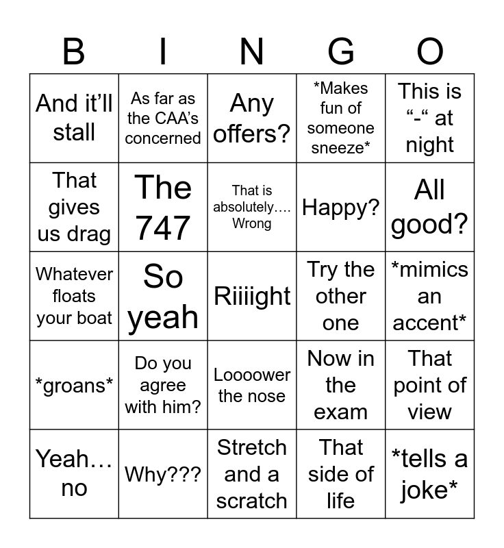 This bingo card has a free space and 27 words: Now in the exam, So why’s that?, Happy?, Stretch and a scratch, That gives us drag, Any offers?, As far as the CAA’s concerned, *groans*, Try the other one, That point of view, Whatever floats your boat, *Makes fun of someone sneeze*, Yeah… no, Why???, All good?, Had enough?, The 747, That is absolutely…. Wrong, Do you agree with him?, And it’ll stall, *mimics an accent*, That side of life, So yeah, *tells a joke*, Loooower the nose, This is “-“ at night and Right that’ll do.