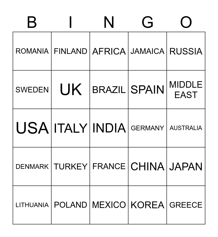 This bingo card has a free space and 24 words: TURKEY, POLAND, BRAZIL, LITHUANIA, RUSSIA, ROMANIA, SWEDEN, FINLAND, GERMANY, FRANCE, SPAIN, USA, CHINA, JAPAN, UK, KOREA, AUSTRALIA, AFRICA, MIDDLE EAST, ITALY, GREECE, DENMARK, JAMAICA and MEXICO.