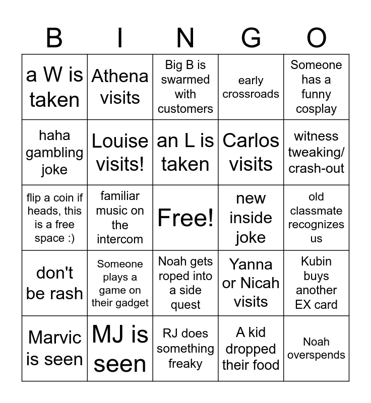 This bingo card has a free space and 29 words: Marvic is seen, RagB visits, familiar music on the intercom, Gelo visits, a W is taken, Big B is swarmed with customers, Louise visits!, Someone plays a game on their gadget, new inside joke, MJ is seen, old classmate recognizes us, Noah overspends, RJ does something freaky, A kid dropped their food, witness tweaking/ crash-out, escape room technical difficulty, Noah gets roped into a side quest, don't be rash, Someone has a funny cosplay, flip a coin if heads, this is a free space :), Yanna or Nicah visits, whatta lucky moment, Carlos visits, haha gambling joke, early crossroads, Athena visits, Kubin buys another EX card, an L is taken and wholesome moment.