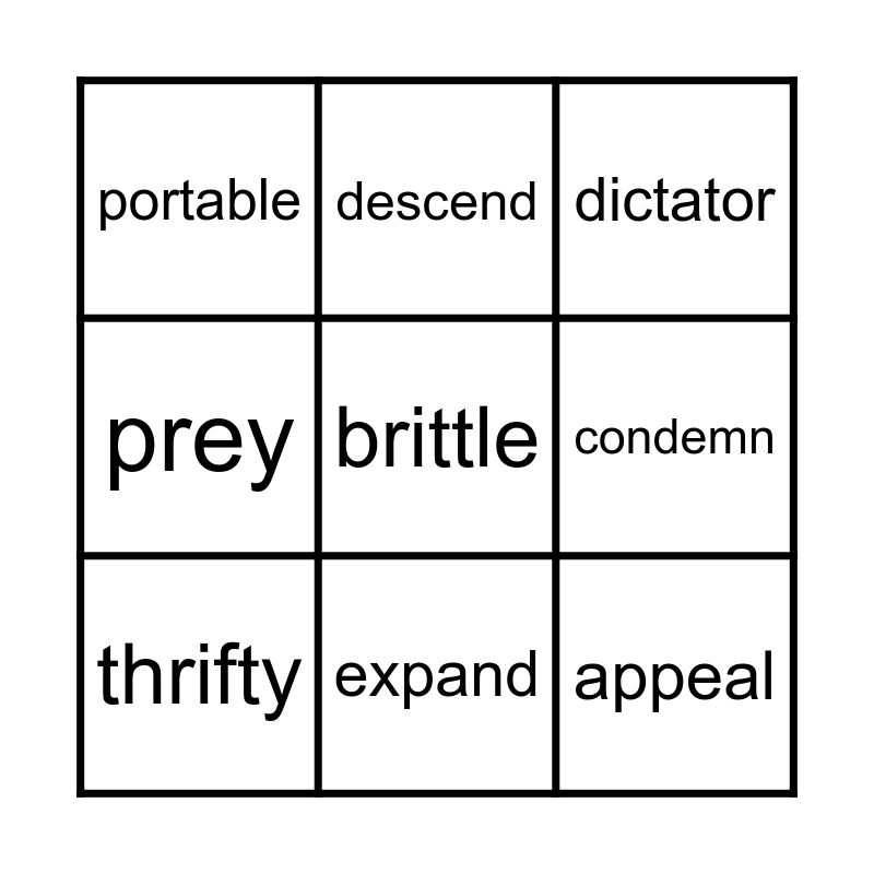 This bingo card has 12 words: abolish, appeal, brittle, condemn, descend, dictator, expand, faminne, portable, prey, thrifty and visual.
