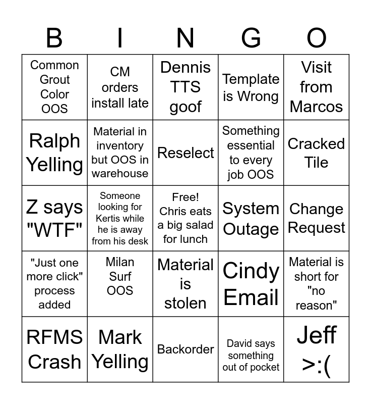 This bingo card has a free space and 24 words: Milan Surf OOS, Mark Yelling, Reselect, RFMS Crash, Visit from Marcos, Common Grout Color OOS, Ralph Yelling, CM orders install late, System Outage, Material is stolen, Something essential to every job OOS, Z says "WTF", Cindy Email, Material is short for "no reason", Material in inventory but OOS in warehouse, David says something out of pocket, Change Request, Dennis TTS goof, Cracked Tile, Someone looking for Kertis while he is away from his desk, Jeff >:(, "Just one more click" process added, Template is Wrong and Backorder.