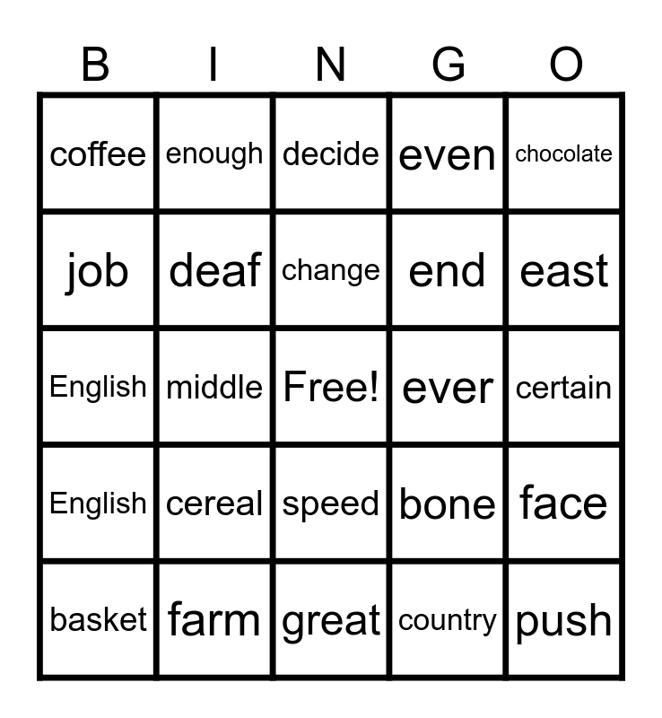 This bingo card has a free space and 24 words: basket, cereal, change, country, chocolate, coffee, enough, decide, ever, certain, English, deaf, bone, face, job, farm, great, even, east, English, middle, speed, end and push.