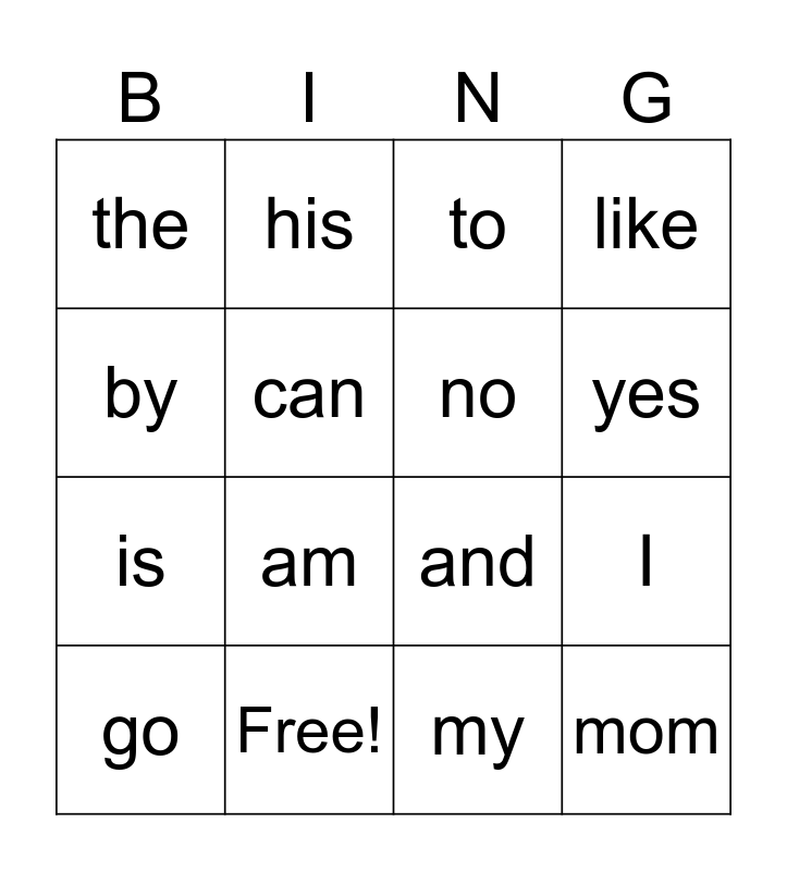 This bingo card has 16 words: Free!, I, to, the, is, his, and, my, by, can, go, like, am, yes, no and mom.