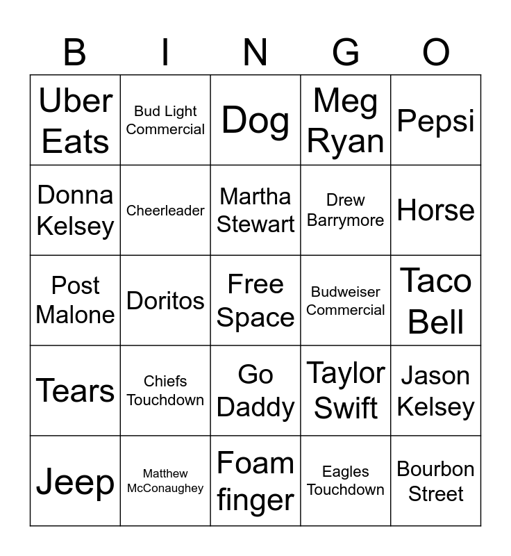 This bingo card has a free space and 24 words: Chiefs Touchdown, Matthew McConaughey, Martha Stewart, Jeep, Pepsi, Uber Eats, Donna Kelsey, Bud Light Commercial, Budweiser Commercial, Go Daddy, Drew Barrymore, Post Malone, Taylor Swift, Jason Kelsey, Cheerleader, Eagles Touchdown, Taco Bell, Dog, Horse, Doritos, Bourbon Street, Tears, Meg Ryan and Foam finger.