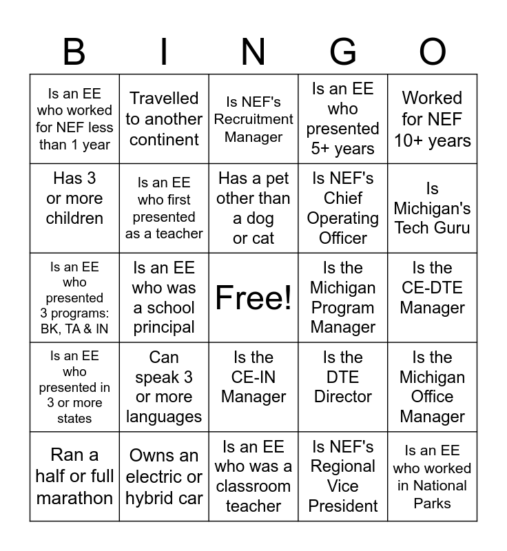 This bingo card has a free space and 24 words: Can speak 3 or more languages, Owns an electric or hybrid car, Has a pet other than a dog or cat, Ran a half or full marathon, Worked for NEF 10+ years, Is an EE who worked for NEF less than 1 year, Has 3 or more children, Travelled to another continent, Is the Michigan Program Manager, Is the CE-IN Manager, Is NEF's Chief Operating Officer, Is an EE who presented 3 programs: BK, TA & IN, Is the DTE Director, Is the Michigan Office Manager, Is an EE who first presented as a teacher, Is NEF's Regional Vice President, Is the CE-DTE Manager, Is NEF's Recruitment Manager, Is Michigan's Tech Guru, Is an EE who was a school principal, Is an EE who worked in National Parks, Is an EE who presented in 3 or more states, Is an EE who presented 5+ years and Is an EE who was a classroom teacher.