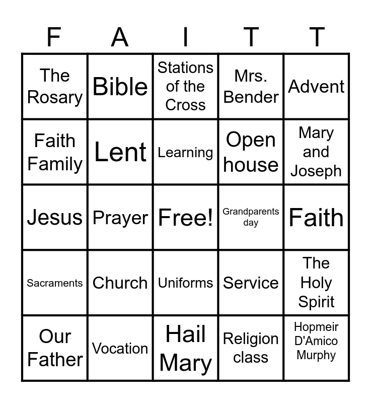 This bingo card has a free space and 24 words: Church, Vocation, Learning, Our Father, Advent, The Rosary, Faith Family, Bible, Grandparents day, Uniforms, Open house, Jesus, Service, The Holy Spirit, Lent, Religion class, Faith, Stations of the Cross, Mary and Joseph, Prayer, Hopmeir D'Amico Murphy, Sacraments, Mrs. Bender and Hail Mary.