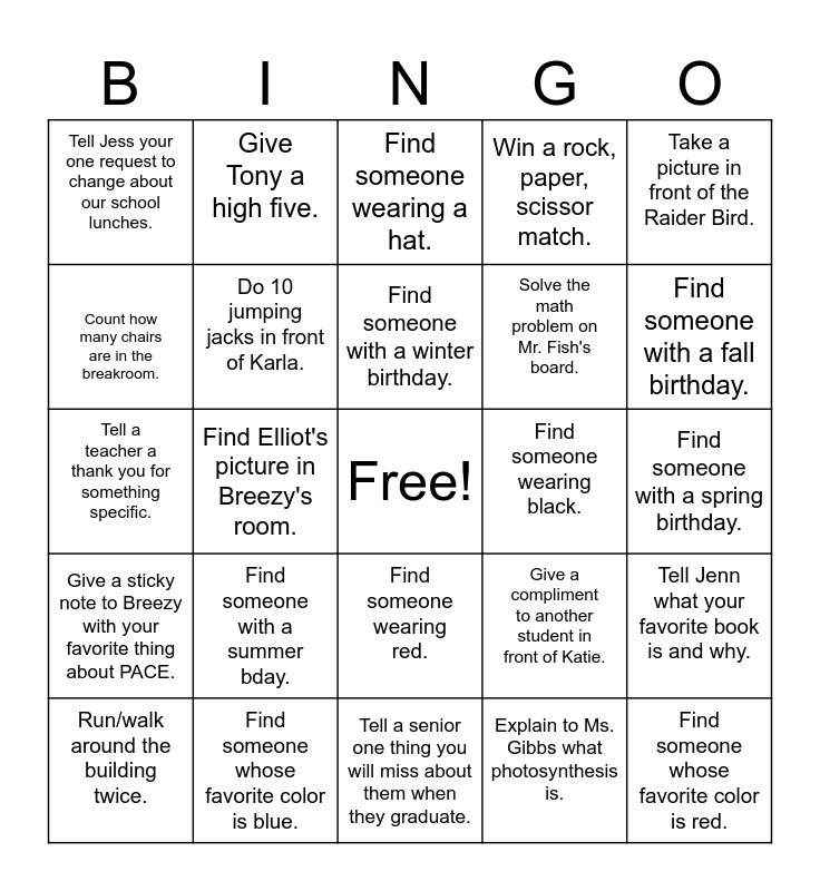 This bingo card has a free space and 24 words: Find someone with a summer bday., Find someone whose favorite color is blue., Find someone with a winter birthday., Run/walk around the building twice., Take a picture in front of the Raider Bird., Tell Jess your one request to change about our school lunches., Count how many chairs are in the breakroom., Give Tony a high five., Find someone wearing black., Find someone wearing red., Solve the math problem on Mr. Fish's board., Tell a teacher a thank you for something specific., Give a compliment to another student in front of Katie., Tell Jenn what your favorite book is and why., Do 10 jumping jacks in front of Karla., Explain to Ms. Gibbs what photosynthesis is., Find someone with a spring birthday., Find someone wearing a hat., Find someone with a fall birthday., Find Elliot's picture in Breezy's room., Find someone whose favorite color is red., Give a sticky note to Breezy with your favorite thing about PACE., Win a rock, paper, scissor match. and Tell a senior one thing you will miss about them when they graduate..